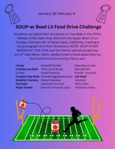 SOUP-er Bowl LX Food Drive for Rutherford Community Pantry – January 26-February 6: Please bring below items needed by the Rutherford Community Pantry to school. Students can place their donations on the table in the office hallway of the team they think will win Super Bowl LX on Sunday, February 8th in Santa Clara, California, creating a real pictograph with their donations! Bring in your items to cast your vote! No matter which team wins Super Bowl LX, we all can be winners by helping our Rutherford neighbors! NOTE: SOUP IS NOT NEEDED AT THIS TIME and the Pantry cannot accept any out-of-date items. Items needed (ones in bold especially) by the Rutherford Community Pantry are: